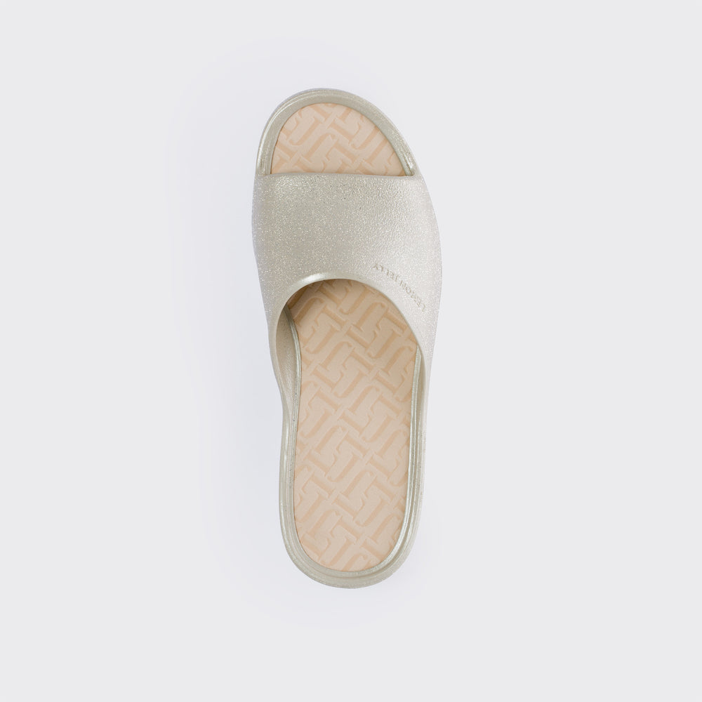 Crafted and designed in Portugal with a focus on premium vegan materials accredited by PETA, these metallic platform slides represent a blend of sustainability and superior quality. Its production in a solar-powered facility underscores a commitment to durability and eco-friendly manufacturing, delivering a unique piece of style and glamour. With a glowing glitter finish and a classic engraved insole, all summer outfits will have a fine companion to match.