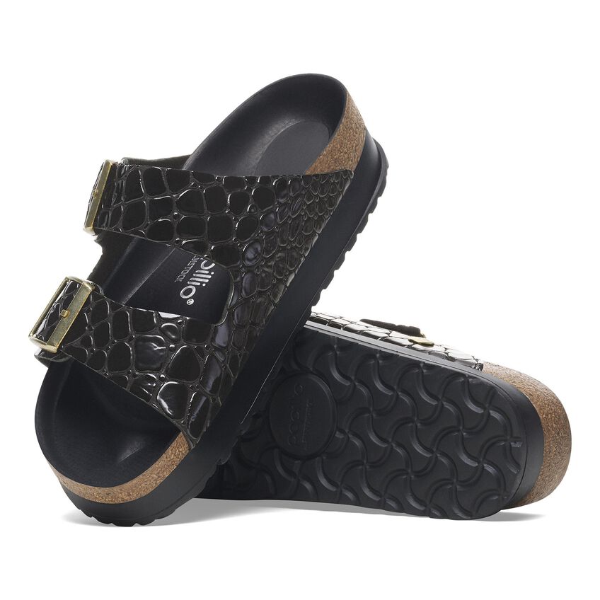 The Arizona is a genuine classic that has been delighting both men and women for decades. Here, Papillio presents the two-strap sandal with a new platform flex outsole. The improved outsole features an extended heel for better stability and weight distribution. An overhauled design with horizontal grooves at the front helps to optimize flexibility and the foot’s rolling motion. The exquisite footbed is fully lined with soft piumato leather, making it exceptionally comfortable. The embossed leather gives the shoe an elegant, feminine look while the crocodile pattern adds a fashionable touch.