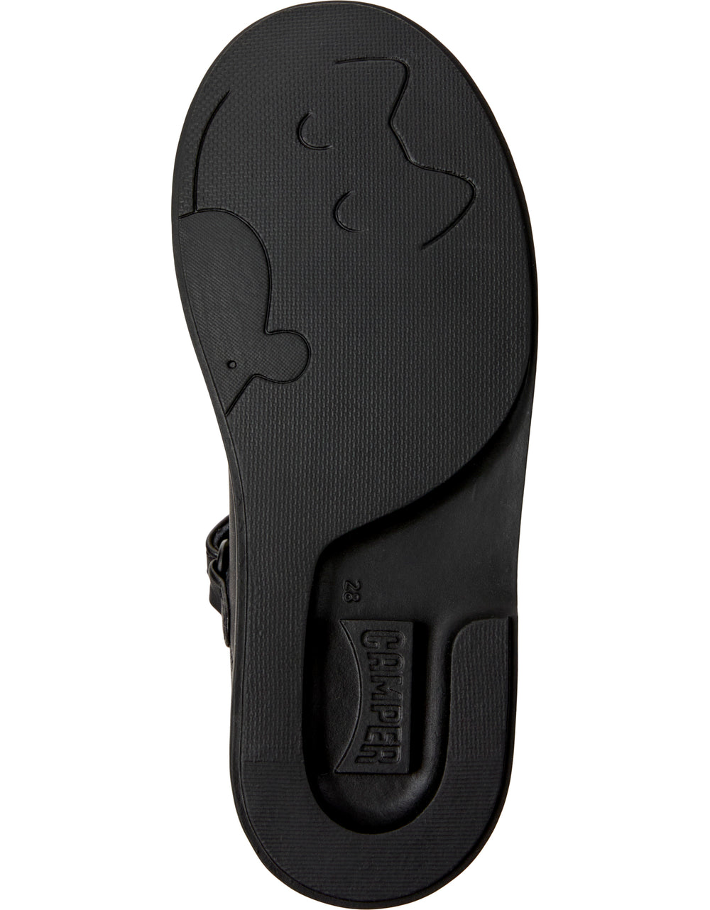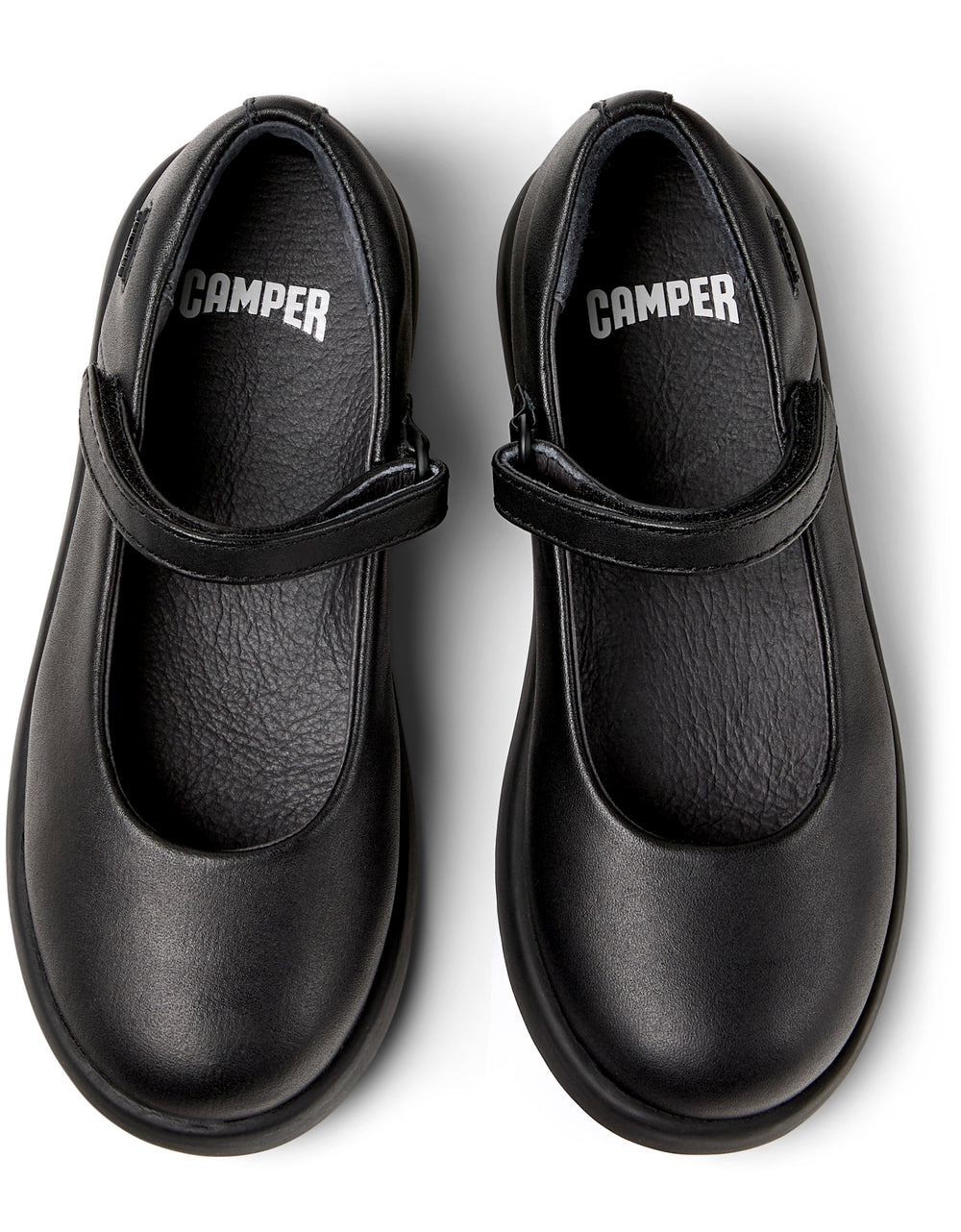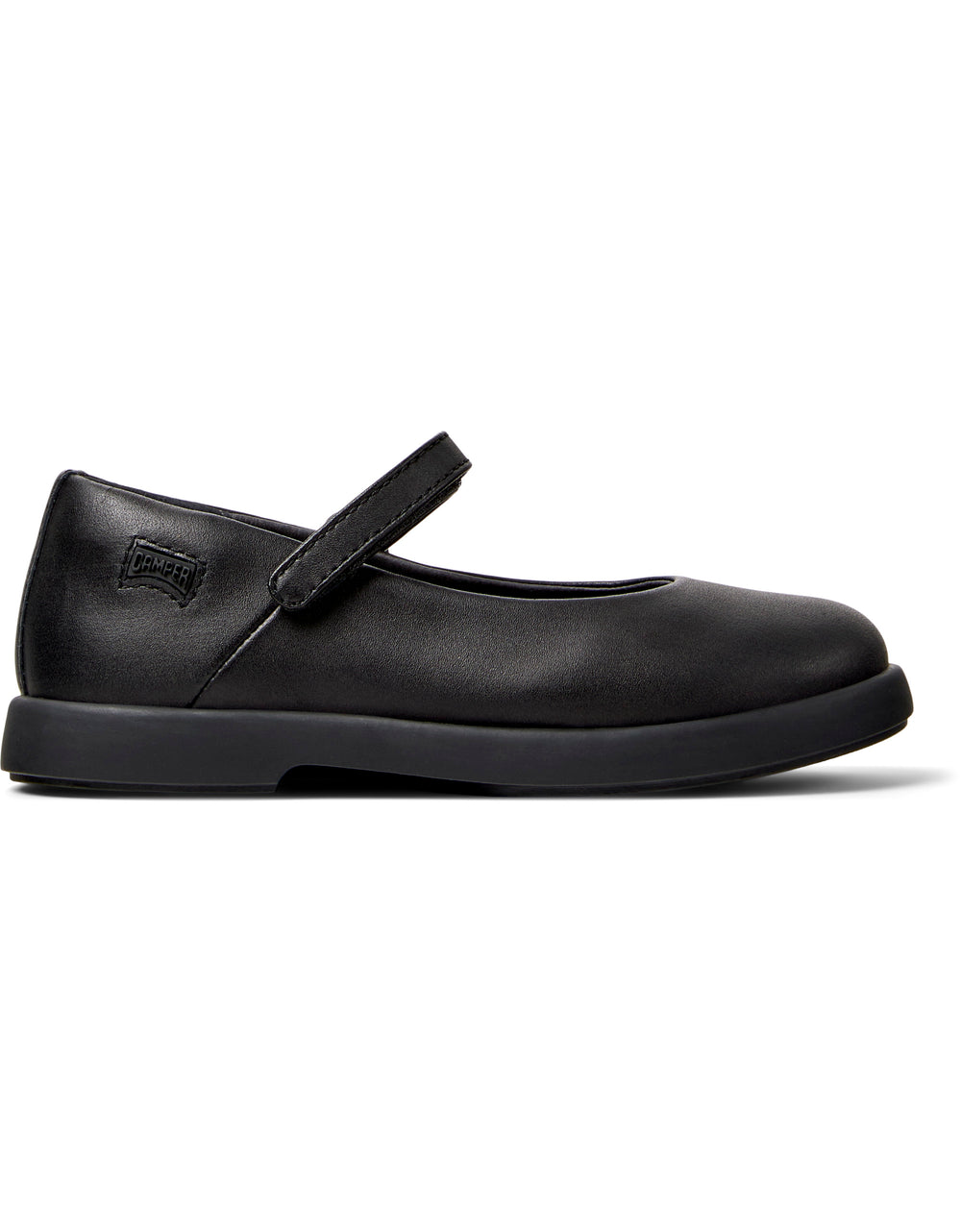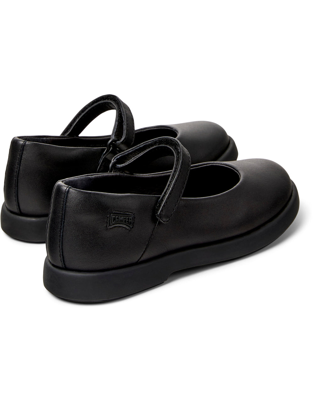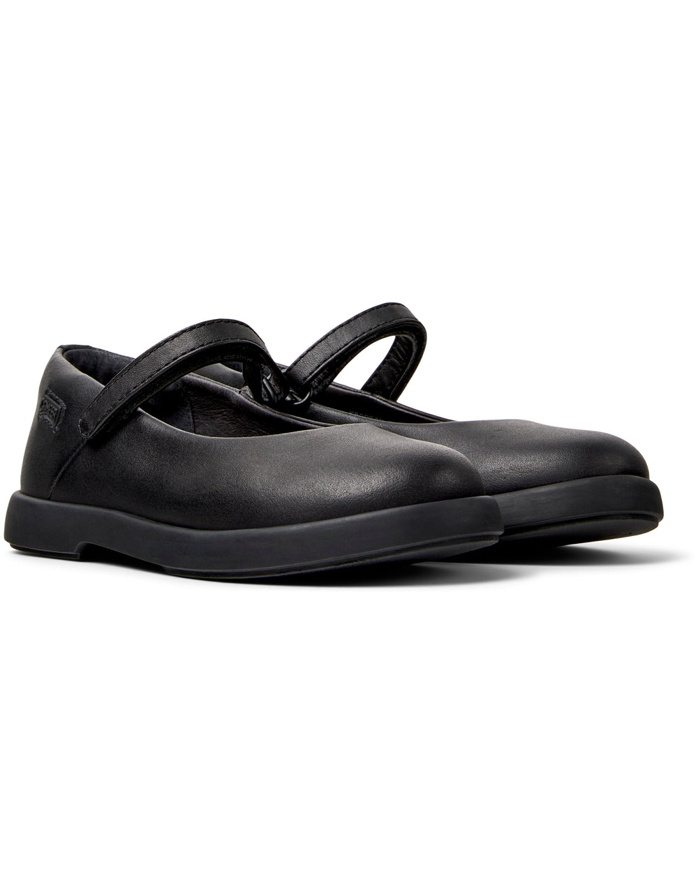 Black calfskin leather kids' ballerinas with OrthoLite® Recycled™ footbeds, hook and loop closing system, and rubber outsoles.