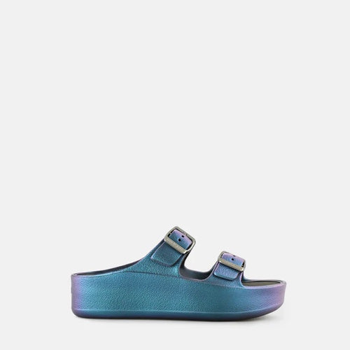 The shimmering effect of these blue sandals with buckles from Lemon Jelly will make you dream with that magical effect of the sun shining bright on the sea. You'll feel ready for summer escapes with this pair of blue sandals with double buckles. Mix them with denim, from jeans to dresses. Produced in Portugal with vegan super-light materials, comfort is combined with style.
