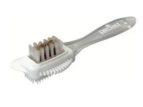 When dust and dirt adhere to suede leather shoes, a strong helper is needed for cleaning. This shoe brush combines nylon and brass bristles and thus signals the fight against soiling. With the rubber studs on the other side you straighten up the fibres after care and thus regain the velvety soft appearance that is so typical for suede shoes. The cleaning edge on the outside of the shoe brush helps you to clean even hard-to-reach areas of the shoe.
